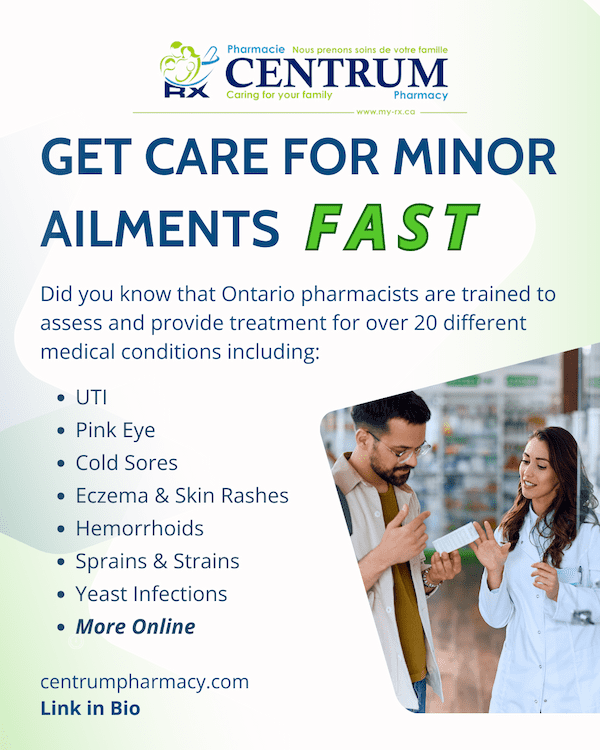 At Centrum Pharmacy, we offer three convenient care options to fit your needs. Our pharmacists can assess and treat a range of minor ailments—such as UTIs, pink eye, cold sores, sprains, and more—six days a week without needing a doctor’s appointment. And for broader medical concerns, our Virtual Walk-In Clinic connects you with licensed physicians via video chat or telephone for free with a valid OHIP card. Finally, our in‑person Walk‑In Clinic, open Mondays through Saturdays, provides onsite Doctors care for non‑urgent illnesses, minor injuries, prescription renewals, emergency contraception, sick notes, and more. These options work together seamlessly to ensure timely, comprehensive care—whether in‑person or online—with minimal wait times.