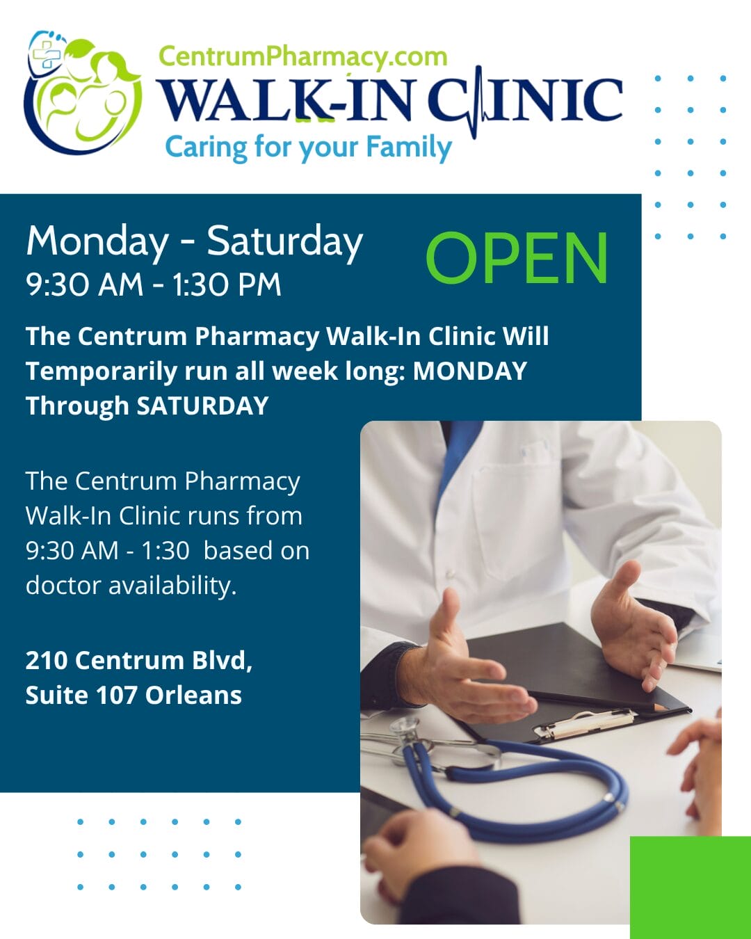 The Centrum Pharmacy Walk-In is Temporarily Running All Week Long – Monday Through Saturday 9:30 – 1:30 Based on Doctor Availability.